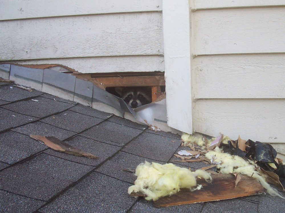 A raccoon ripped a hole in a wall to get in an attic