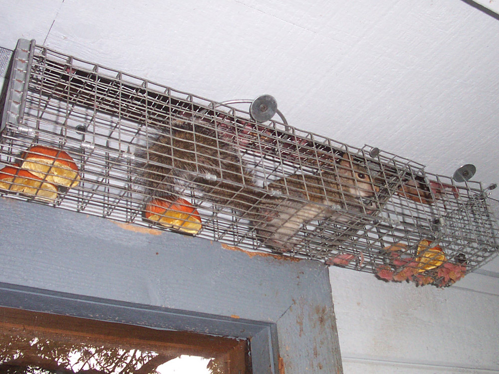 If you look carefully, you can see that a squirrel chewed an open area in this soffit vent screen. I set a repeater trap with what is called a nose cone, in order to force the squirrel into the trap.